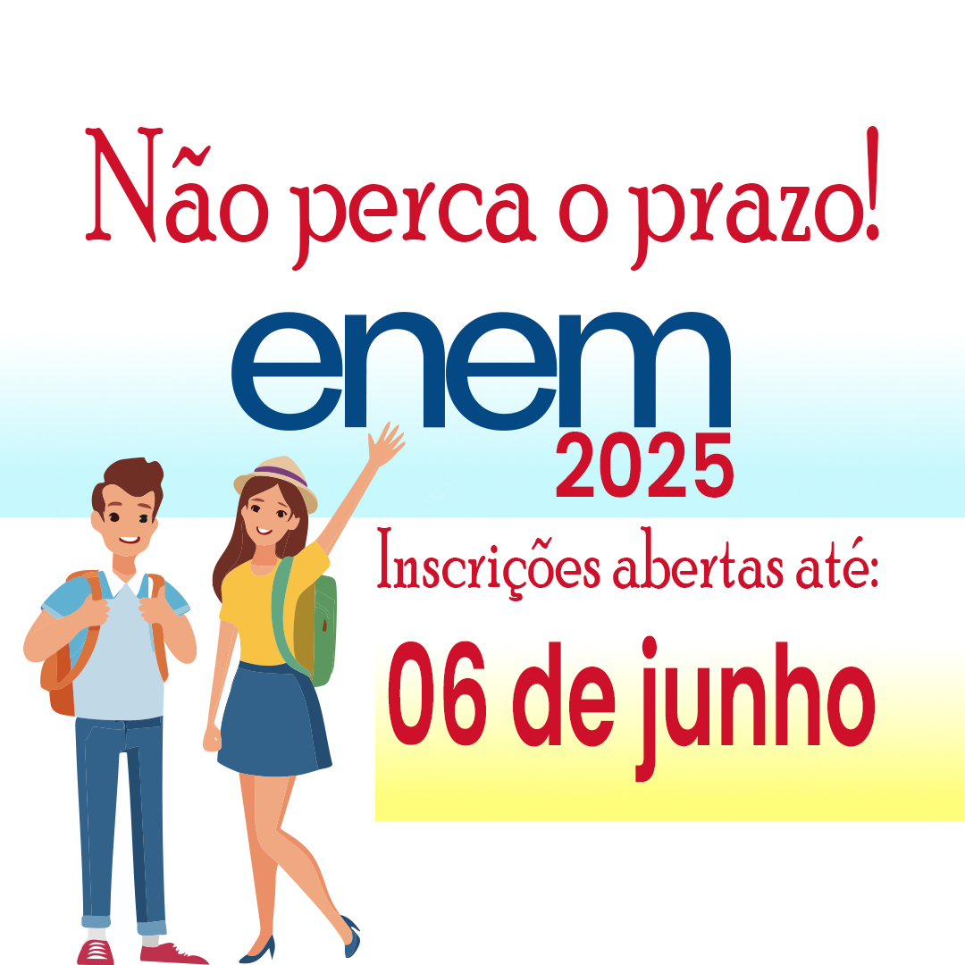 Inscrições abertas até: 06 de junho – o prazo também vale para os pedidos de atendimento especializado e tratamento por nome social. Faça sua inscrição no site oficial: enem.inep.gov.br/participante Provas. O Enem 2025 será aplicado nos dias 9 e 16 de novembro, em todo o Brasil. São quatro provas objetivas e uma redação em língua portuguesa.