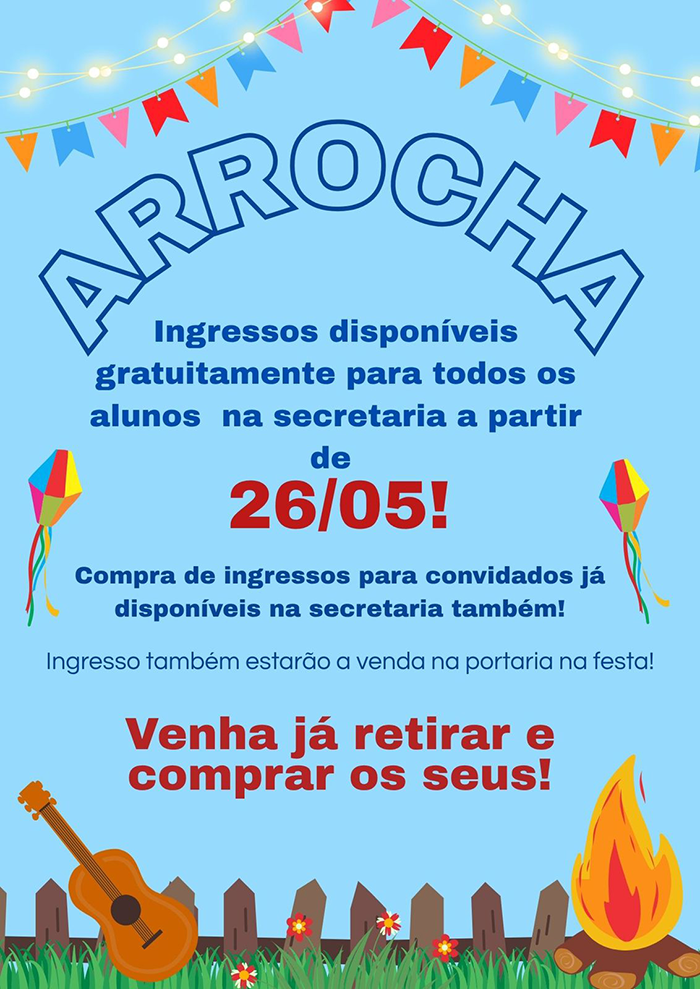 Ingressos disponíveis para todos os alunos na secretaria. Compra de ingressos para convidados na secretaria ou na portaria da festa.